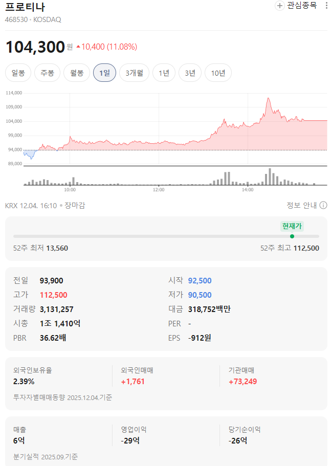 결국 프로티나는 기술 기반 잠재력은 뛰어나지만, 성과 실현 전까지는 하이 리스크 종목입니다.