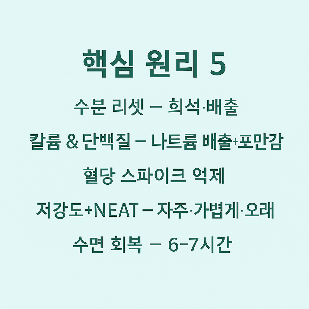 - 수면 회복: 6–7시간 숙면으로 호르몬(렙틴/그렐린) 균형 회복.
