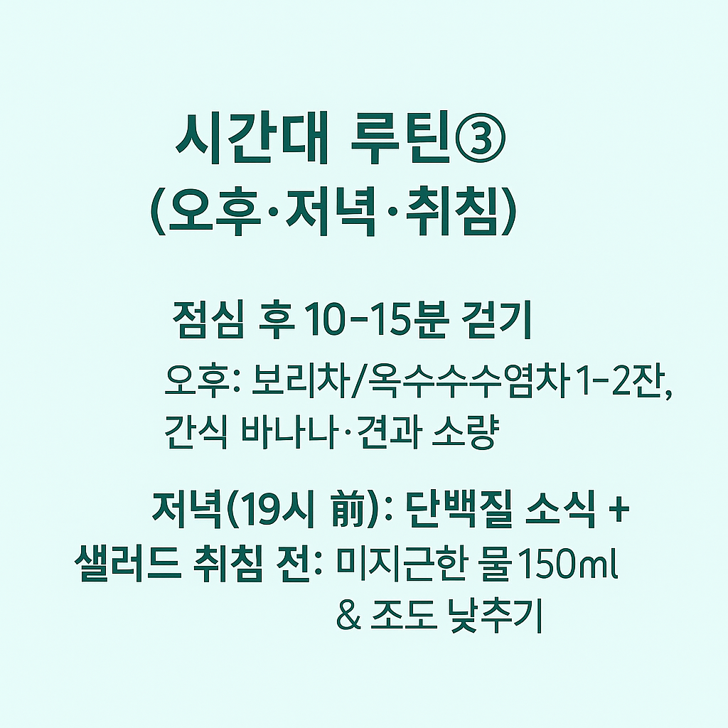 | 점심 후 | 10~15분 걷기 | 식후 혈당 상승폭 완화, 순환 개선 |