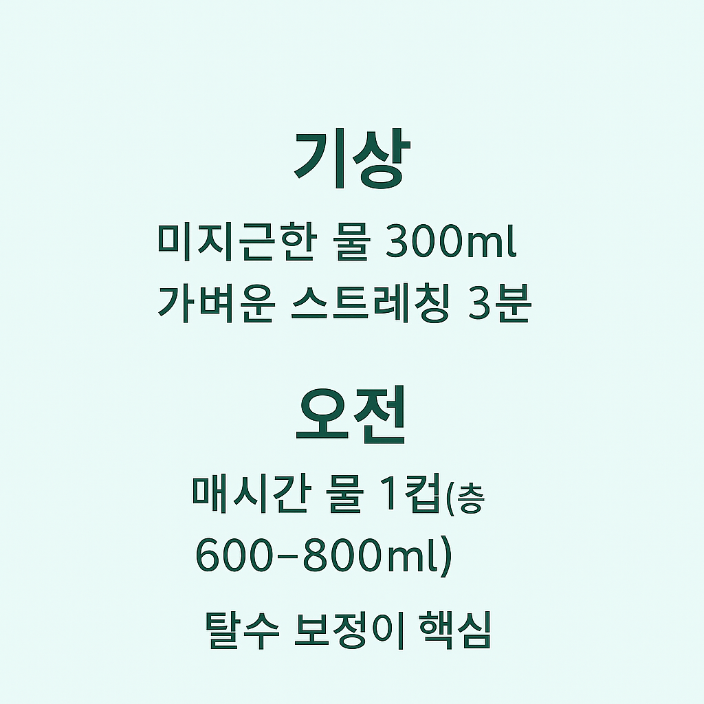 | 오전 내내 | 1시간마다 물 1컵(200ml), 총 600~800ml | 과음 다음날은 탈수 보정이 핵심 |