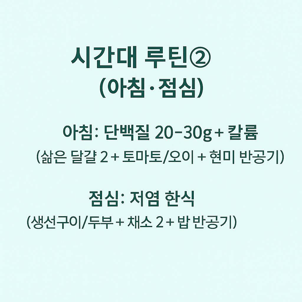 | 아침 | 단백질 20~30g + 칼륨: 삶은 달걀 2개 + 토마토/오이 + 현미반공기 | 혈당 완만, 포만감↑, 나트륨 배출 보조 |